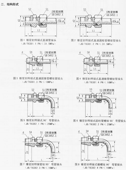 一.概述 适用于以油,气为介质的管路系统用锥密封焊接式管接头,工作温度为—25—+80℃。 锥密封焊接式直通管接头、锥密封焊接式直通圆柱管螺纹管接头、锥密封焊接式直通圆锥管螺纹管接头、锥密封焊接式 锥螺纹管接头、锥密封焊接式90‘弯管接头、锥密封焊接式圆柱管螺纹90’弯管接头、锥密封焊接式圆锥管纹90‘弯管接 头、锥密封焊接式锥螺纹90*弯管接头、锥密封两端焊接式直通管接头、锥密封焊接式直角管接头、锥密封焊接式三通管接 头、锥密封焊接式隔壁直角管接头、锥密封焊接式隔壁直通管接头的形式和尺寸按图1—图13和表中的规定。 | |