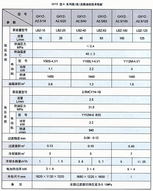 一.使用条件 本产品适用于装有动静压轴承的磨机、轧钢机、电机等大型设备的稀油 循环润滑系统中,其工作介质为N22—N320(相当于ISO VG22-VG320)的各 种工业润滑油。 根据动静压润滑工作原理,在启动、低速和停车时用高压系统,正常运 行时用低压系统,以保证大型机械在各种不同转速运行下均能获得可靠的润滑 以延长主机寿命。 稀油站的高压部分压力为31.5MPa,流量为2.5L/rain,低压部分压力为 0.4MPa;流量为16—125L/rain,稀油站具有过滤、冷却、加热等装置和联 锁、报警、自控等功能。 该产品的性能参数及尺寸应符合表和图中的规定;装置由油站、仪表盘、 电控柜(可用PLC控制)成套组成。 |