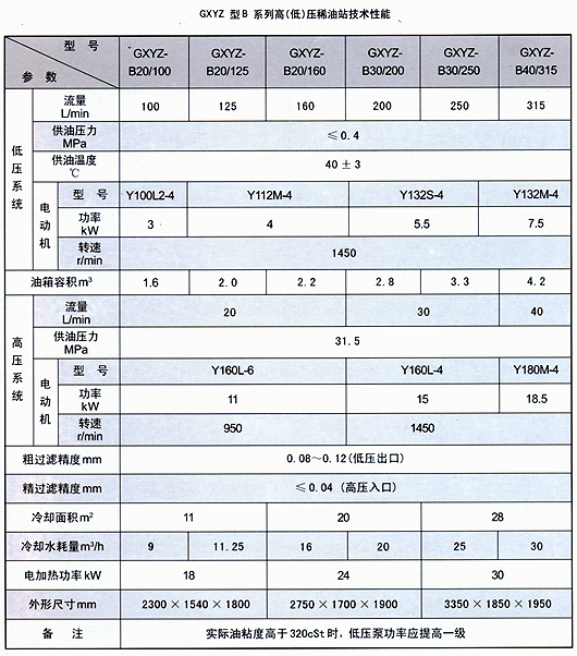 一.使用条件 与GXYZ型A系列基本一致,但工作介质粘度范围为N22—N460(相当ISO VG22—460)另外B系列的除高压和 低压的供油压力不变分别为31.5MPa和0.4MPa外,其高压和低压的流量均有较大增加,详见下面技术性能表(规格最大的 高压流量为~L/mm,低压流量为315L/min)。 本装置由油站、仪表盘、电控柜(可用PLC控制)成套组成, 本产品的性能参数及尺寸应符合表和图中的规定 |