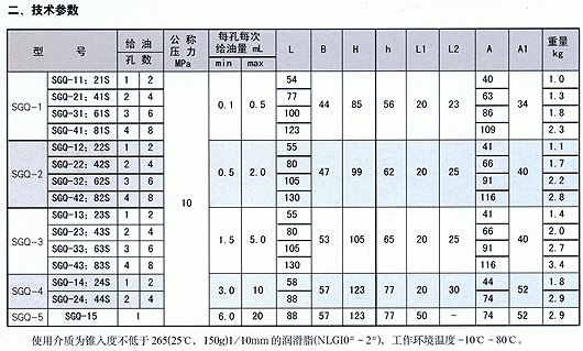 一、概述 SGQ系列双线给油器适用于公称压力为10MPa的双线式干油集中润滑系统中,作为一 种计量给油装置。它在二条供油管交替的供油压力作用下,由供油压力推动活塞给油,完成 向各润滑点定量分配润滑脂的功能。 GQ双线给油器有单向出油和双向出油二种结构形式。单向出油的给油器只有下给油 孔,活塞正反排油时都由下给油孔向润滑点供送润滑脂双向出油的给油器有上、下给油孔, 活塞正反向排油时由上下给油孔交替向润滑点供送润滑脂。给油器可以从指示杆的动作直接 观察到给油器的工作情况,还可以通过调节螺丝在规定范围内方便地调整各给油口的给油量 |