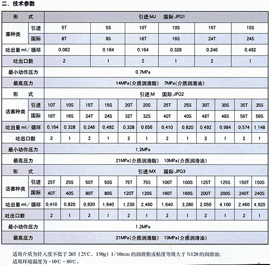 一、结构特点和应用范围 JPQl、JPQ2、JPQ3型单线递进式分配器,是我公司转化国外技术自行研 制开发并己积极大量推广使用的产品之一。它由中碳合金结构钢制造的供给体、 端部体和3—8片根据设计需要所确定选择吐出量和吐出口数的中间体组合而成。 分配器的正常出口设置于分配器的两侧面,在上平面还设置有预备出口。 JPQI,JPQ2、JPQ3型分配器,适用于润滑点密集,耗脂量不同,给油频 繁,公称压力为20MPa的单线集中润滑系统中。 JPQl引进型号MJ.JPQ2引进型号M。JPQ3引进型号MX。。 |