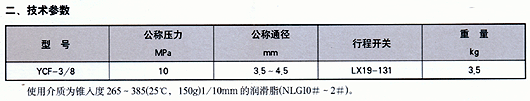 YCF—3/8型压力操纵阀是安装在流出式干油集中润滑系统主输油管最 远的支油管末端,专门用来控制电动干油站上的电磁换向阀的换向。(在压 力操纵阀的后面,须再装一个给油器)