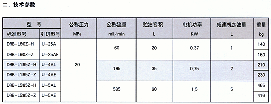一、概述 DRB-L系列电动润滑泵适用于配置润滑点频率高, 润滑点多,配管长度长,分布范围广,公称压力为20MPa 级的双线式干油集中润滑系统。 该系列电动润滑泵是一种由电动机直接驱动柱塞泵, 排出润滑脂的电动润滑泵。有二种配管方式,三种流量系 列,组成六种不同规格,选择范围广,可满足各种机器设 备的润滑需要,对于大型机组和生产线尤为适宜。 |