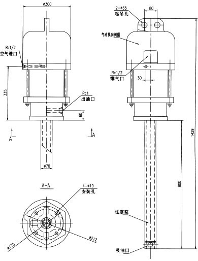 三、使用要领 1、以托架(用户自备)作支承,用四只M16的螺栓把气动泵固定在托架上,柱塞泵管垂直插入贮油箱的油脂中。 2、进气管路上必须配接气源处理处理三大件(过滤、减压、油雾器),目的是使气动泵能获得洁将、稳压、带油雾状的压缩空气。 3、所使用的介质必须在规定范围内。 4、气动泵出油口处必须配接单向阀。 5、建议供气量调定在泵工作频率不超过20次/min为宜。 6、使用2#油脂时建议油箱内加设压油盘,以免因润滑脂流动性差而使泵产生吸空。 7、排气口配接消声器(用户自备,接口Rc1/2)。