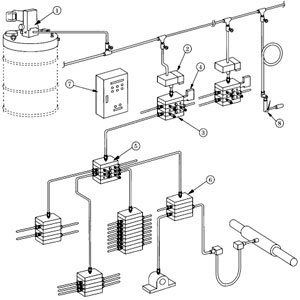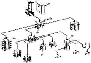 孙分配器 | 5、单泵多区域给油方式 这种给油方式特别适合于长达数百米的轧制机组上使用。 由中央泵把油脂送入F50mm左右的主管,再由主管送往各区域的分管,分管上装有电磁阀,通过电磁阀的开与闭,可以间断地将润滑脂送到各区域的分配器,再向润滑点给脂。 使用这种系统,可以对数千个轴承都能用一台中央泵自动地进行给脂