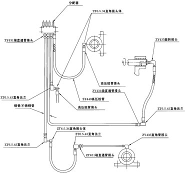 配管例③(分配器→轴承配管要领-固定部位) 润滑点可以有固定、移动、旋转三种不同类型,其配管方法各异。对于固定不动的部件,一般工作场合的配管主要使用铜管,特殊场合则使用不锈钢管,分配器出口侧采用端直通管接头,轴承侧应使用直角管接头或端直通管接头。 |