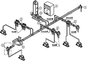 二、特 点 适用于润滑点众多,给油量相同、分布集中的场合。 空间狭小难于确认分配器动作的场合,使用效果好。 和压力控制阀配合使用,可以采用细长的管路。 检查部位集中,便于维护管理。 四、系统装置简图