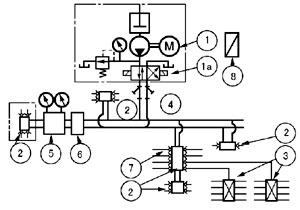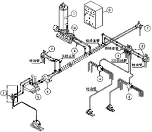 一、系统介绍 电控柜④内的指令时间继电器使系统按照设定的给油间隔时间自动动作,指令时间用”给油时间延长“表示给油工作的异常,另设有”贮油器空“、”过负荷运转“等警报信号。指令时间继电器按系统一次给油工作实际所需时间加2~5分钟来调整。 液压换向阀 1a 具有切换两条供油主管和控制供油主管末端的压力的功能,当供油的主管的末端压力达到液压换向阀的设定压力,液压换向阀换向,并向电控柜发送信号,润滑泵①停止,系统再次工作,从另一条主油管供油。 系统设计通常按给油时间5分钟以内(最高8分钟以内)设计,液压换向阀的标准设定压力为5MPa。